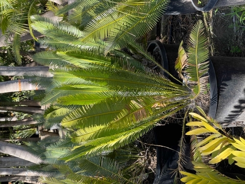 .7-1.4 m long, bluish-green leaves that taper on each end, with 120-160 linear-lanceolate leaflets